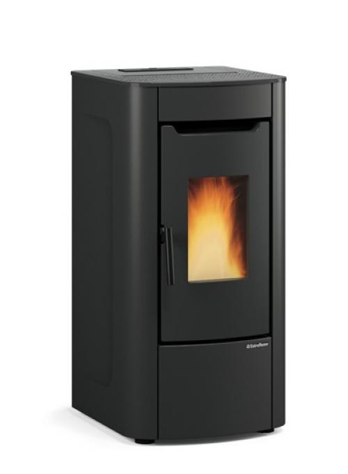 De La Nordica Extraflame Sabry 5.0 is een pelletkachel met een fraaie en strakke vormgeving door de bekleding in gelakt staal, verkrijgbaar in de kleuren ivoor, zwart en brons.